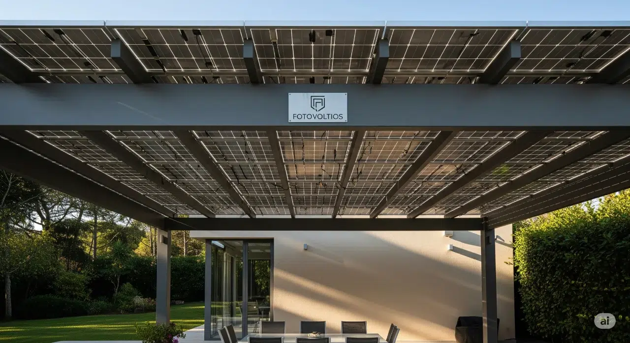 Placas solares bifaciales instaladas en una pérgola moderna.